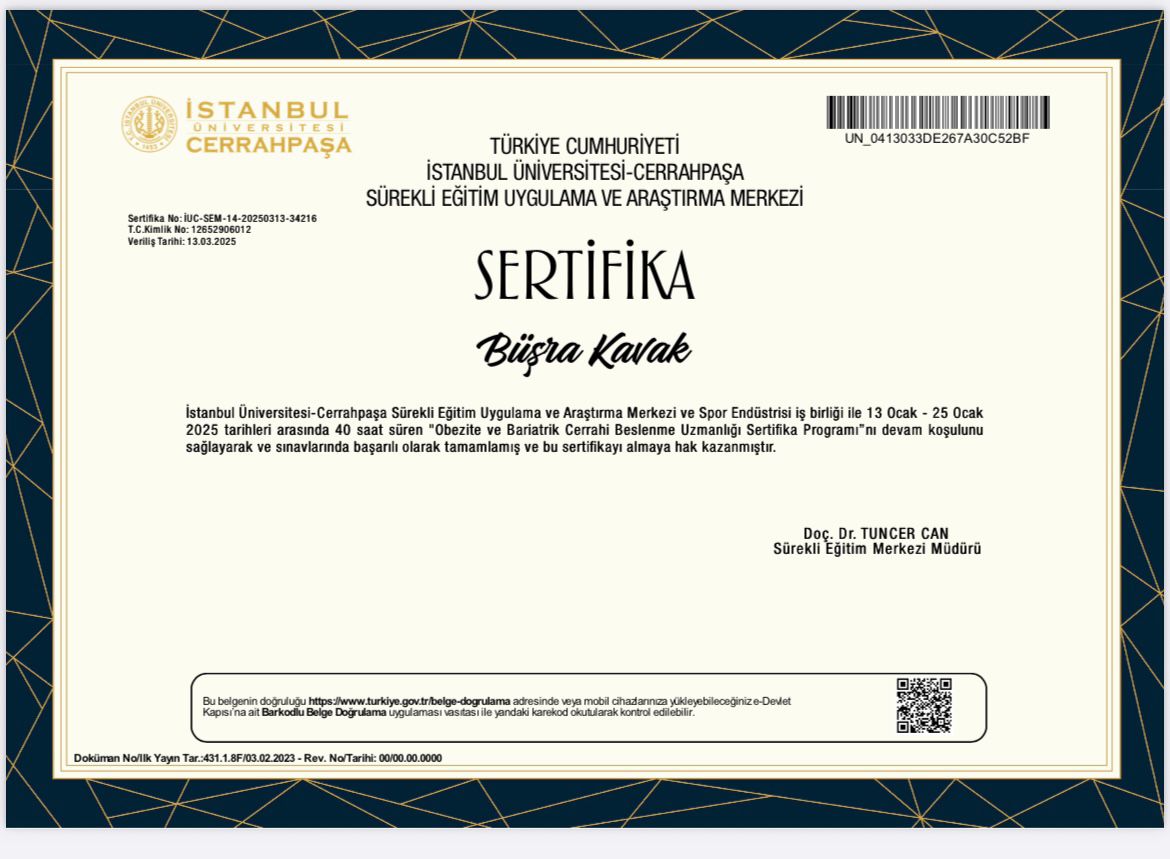 Bursa doğumlu bir diyetisyen olarak kariyerime hem akademik hem de profesyonel anlamda sağlam bir temel oluşturarak başladım. Muğla Sıtkı Koçman Üniversitesi’nden mezun olduktan sonra, mesleki yetkinliğimi artırmak amacıyla çeşitli sağlık kuruluşlarında staj deneyimleri edindim.